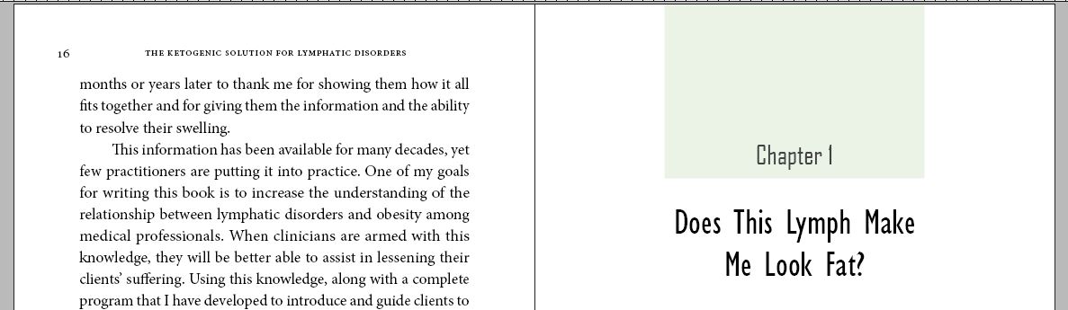 In addition, the Chapter pages can have various design elements, ornaments, quotes or large spaces above or below the chapter title. You get to decide all that. Below is an example of chapter heading with a color box bleed. You can see the running header on the left.